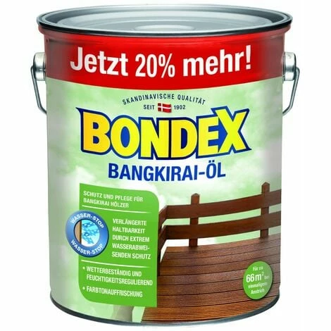 Der optimale Witterungs- und UV-Schutz für Terrassendielen, Sichtschutzelemente und Gartenmöbel aus Bangkirai-Holz. Schutz, Pflege und Farbtonauffrischung.Bangkirai ÖlFarbton: BangkiraiInhalt: 3 lfür Außennicht deckendErgiebigkeit: Ca. 45 ml/m2. 1 Liter reicht für bis zu 22 m2. Auf rauen und geriffelten Hölzern höherer Verbrauch. Genaue Menge durch Probeauftrag ermitteln.lasierendÜberstreichbar nach ca. 24 Stunden (23°C/ 60 % rel. Luftfeuchtigkeit). Durchgetrocknet nach ca. 1 Woche. Bei niedrigen Temperaturen und/oder hoher Luftfeuchtigkeit wird die Trockenzeit verlängert. Probeanstrich durchführen.Außen: Z. B. für Terrassendielen, Gartenmöbel, Sichtschutzelemente aus Bangkirai, Hart – und Tropenhölzer oder Thermoholz. Hinweis: Holzpflegeöle und Lasuren sind nur bedingt trittfest. Laufspuren (z.B. auf Terrassenböden) regelmäßig nachpflegen. Nicht für WPC (wood – plastic – composites) geeignet.streichenDer optimale Witterungs- und UV-Schutz fu?r Terrassendielen, Sichtschutzelemente und
