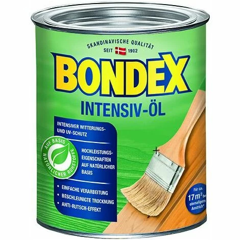 Intensiver Witterungs- und UV-Schutz mit Hochleistungseigenschaften auf Basis natürlicher Rohstoffe. Einfach Verarbeitung, beschleunigte Trocknung und Anti-Rutsch-Effekt. Auf Wasserbasis.Intensiv ÖlFarbton: TeakInhalt: 2,5 lfür Außennicht deckendErgiebigkeit: Ca. 45 ml/m2. 1 Liter reicht für bis zu 22 m2. Auf rauen und geriffelten Hölzern höherer Verbrauch. Genaue Menge durch Probeauftrag ermitteln.lasierendÜberstreichbar nach ca. 1 Stunde (23°C/ 60 % rel. Luftfeuchtigkeit). Begehbar nach ca. 1 Stunde. Bei niedrigen Temperaturen und/oder hoher Luftfeuchtigkeit wird die Trockenzeit verlängert. Probeanstrich durchführen.Um einwandfreie Trocknung zu erzielen: – für gute Belüftung sorgen. (Geringer Luftwechsel, z.B. durch dichte Stapelung, verzögert die Trocknung) – sind die empfohlenen Auftragsmengen unbedingt einzuhalten. (Zu hohe Schichtdicken führen zu einer deutlichen Trocknungsverzögerung!)Außen und Innen: Z. B. für Gartenmöbel, Pergolen, Terrassendielen, Wandpaneele, Holzfußböden
